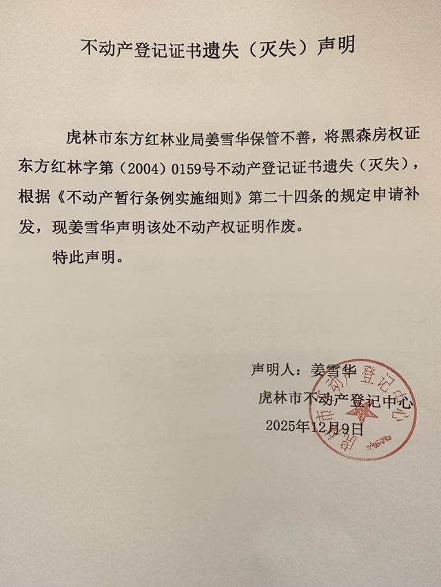 不動(dòng)產(chǎn)權(quán)證書遺失聲明-姜雪華