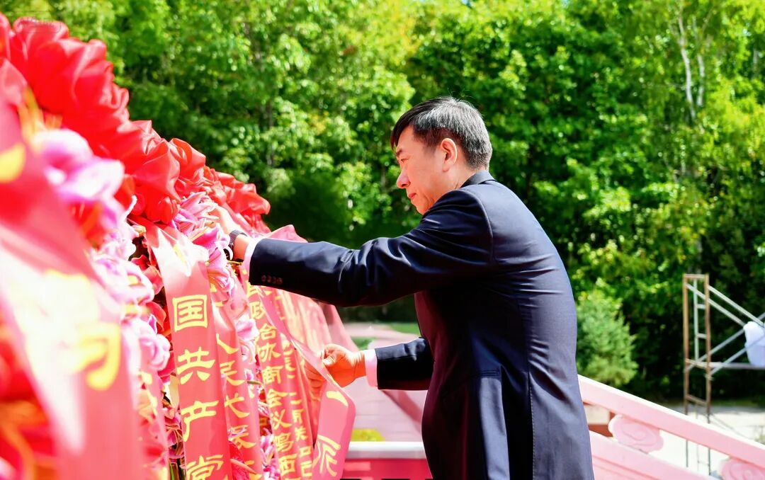 在《獻花曲》旋律中,18名禮兵抬著花籃緩步走向烈士紀念碑并整齊擺放。孫成坤緩步上前,仔細整理花籃緞帶。隨后,雞西市、虎林市領導及各界代表緩步繞行,瞻仰烈士紀念塔,表達對英雄烈士的深切追思與崇高敬意。